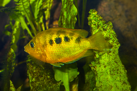 Skvrnivec žlutý patří k druhům, které z akvaristického pohledu můžeme označit jako „ryby, které odvál čas“. Do Evropy byl tento druh poprvé dovezen už na počátku 20. stol. Milan Chvojka o něm publikoval článek v Živě již v roce 1956, od 60. do 80. let minulého století nechyběl jeho popis snad v jediné české akvaristické knize, a i když nikdy nešlo o druh masově chovaný, nebyl problém alespoň čas od času na něj v některé akvaristické prodejně narazit. V posledních desetiletích ale z akvárií vymizel a chová se jen výjimečně. Jde přitom o „příjemně“ malou rybu, která dorůstá jen kolem 8 cm, a navíc je zajímavá biologicky. Chov není nijak náročný, pokud ale zajistíme skvrnivcům odpovídající podmínky. A to může být trochu kámen úrazu, neboť skvrnivci vyžadují zásaditou (pH 7,2–8,5) a tvrdou vodu, nejlépe s přídavkem mořské soli, tj. vodu brakickou. A do takových podmínek se jim poměrně obtížně hledají spolubydlící, resp. nelze je kombinovat s libovolnými rybami, které by se líbily chovateli, ale jen s určitými konkrétními druhy, jimž se bude dařit v daných podmínkách. Totéž platí pro výběr rostlin. Ideální je chovat skupinu alespoň 6–8 jedinců, z nichž se přirozenou cestou vyberou páry. Pohlaví se u skvrnivců mimo dobu tření nedá poznat. Vnitrodruhová agresivita je u tohoto druhu minimální, důležité však je, aby akvárium obsahovalo dostatek úkrytů a dekorací, které rybám usnadní vytváření teritorií. V ojedinělých případech ale byla v akváriu pozorována značná agresivita samce vůči samici po výtěru. O potomstvo se při normálním průběhu odchovu starají oba rodiče, často velmi dlouho. Po rozplavání potěr zhruba v prvních třech dnech svého života okusuje kožní hlen z boků rodičů podobně, jako tomu je u terčovců. V akváriích byla v minulosti vyšlechtěna zlatá forma, a pokud se dnes se skvrnivcem žlutým někde setkáme, jsou to v naprosté většině případů právě jedinci této formy, nikoli jedinci divoce zbarvení.