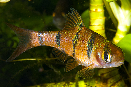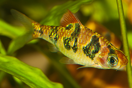 | parmička purpurová | Puntius nigrofasciatus | Pethia nigrofasciata |