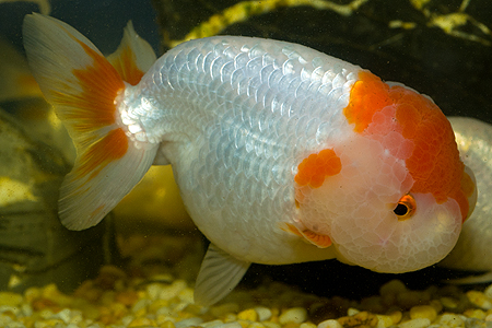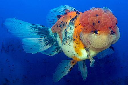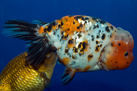 Oranda: Charakteristickým znakem je přítomnost malinovité čepičky zakrývající horní polovinu hlavy (někdy sahá i pod oči na tváře a skřele) v kombinaci s přítomností hřbetní ploutve. Ocasní i řitní ploutev jsou dvojité. V literatuře se někdy objevuje u této formy také pojmenování „lví hlava“, které se pro ni v historii rovněž v určitém období používalo. V současnosti se ale toto označení užívá pro ryby bez hřbetní ploutve – viz následující forma.