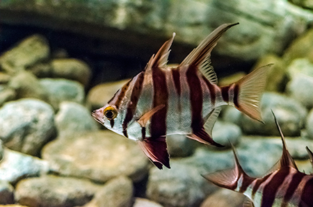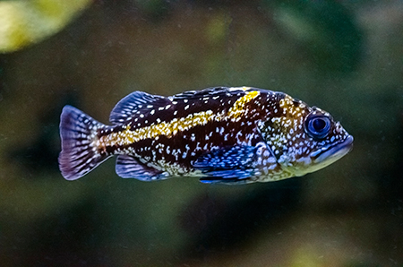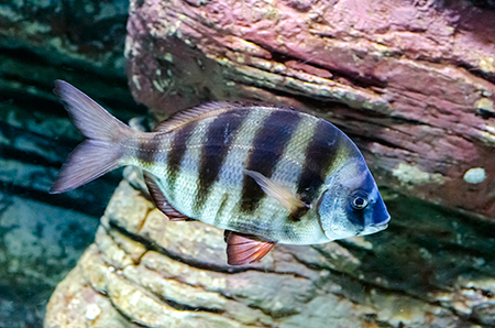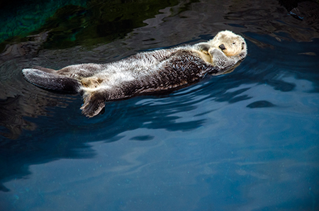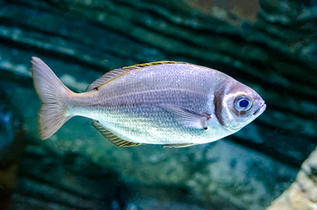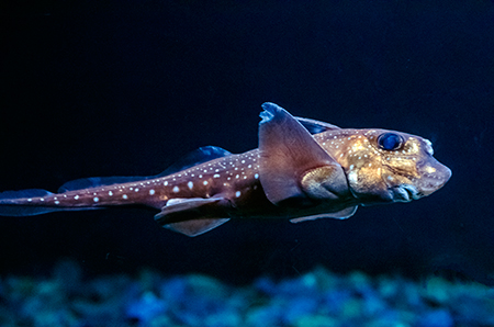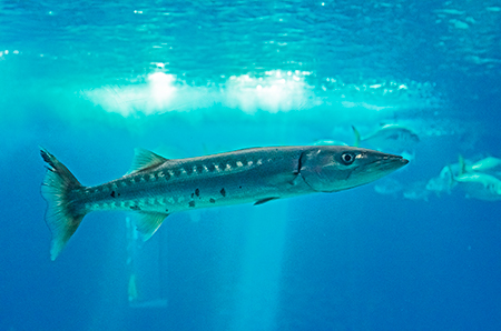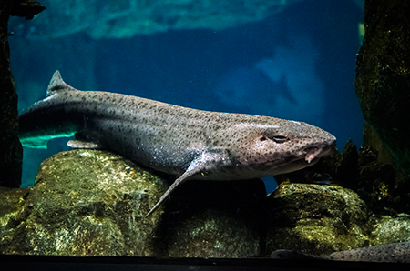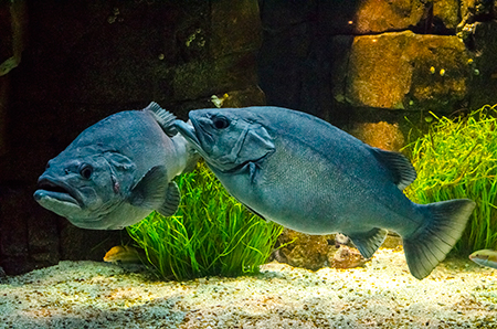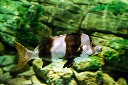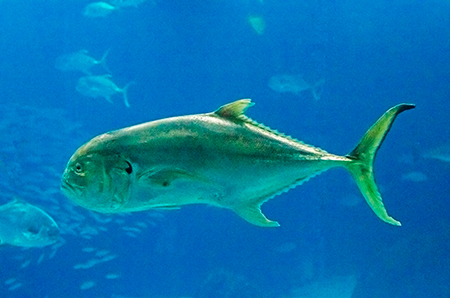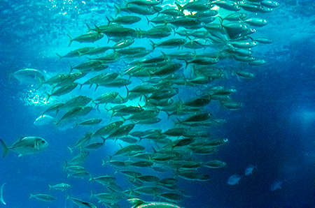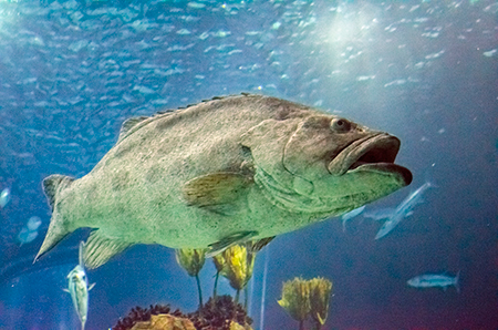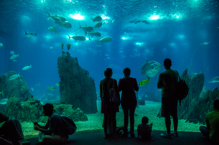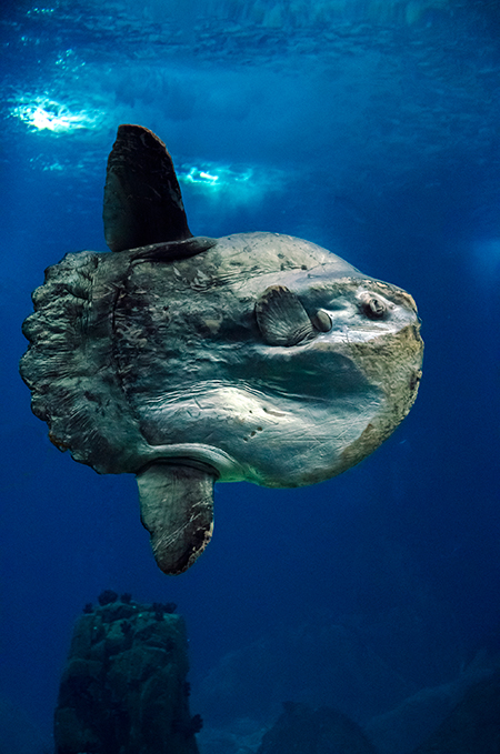 Z modravé nicoty se vyloupne šedý stín. Drobné pohyby ocasu ženou vpřed nehybné tělo, které získává stále konkrétnější tvar. Hlava vytažená do špičatého rypce, drobná očka a pod nimi pootevřená ústa s nepřehlédnutelnými zuby – žralok hnědý (Carcharhinus plumbeus). Sotva začne zase mizet v modré dálce, připlouvá s velebným máváním křídlovitě zvětšených prsních ploutví siba býčí (Pteromylaeus bovinus). Od tvarově podobné siby deskozubé (Myliobatis aquila) se snadno pozná podle světlé pruhované kresby na hřbetní straně těla. A za ní pro změnu manta velká (Mobula mobular), obr se zvláštními hlavovými výběžky prsních ploutví. Pod hladinou se v úžasné synchronizaci pohybů všech svých členů otáčí hejno štíhlých makrel. Kus pod nimi proplouvá menší skupina podstatně větších a zavalitějších kranasů dvouskvrnných (Caranx hippos). A pak to přichází: šedé tělo z boku kotoučovité, zepředu překvapivě úzké, nahoru a dolů z něj vyčnívají pádlovité ploutve hřbetní a řitní, do stran kolmo odstupují malinké ploutve prsní, podivně zubatá ocasní ploutev se mírně vlní – měsíčník svítivý (Mola mola), jedna z nejvzácněji chovaných ryb v péči člověka. A taky vůbec největší druh kostnatých ryb – měsíčník může být až 3 m dlouhý a vážit přes 2 t. Teprve při pohledu na živého jedince si člověk uvědomí, jak výstižné je jeho vědecké pojmenování. Mola znamená v latině „mlýnský kámen“. Divadlo, které se odehrává v 7 m hluboké hlavní nádrži Lisabonského oceanária, se neomrzí. Však také před hlavními průhledy, konkávními akrylátovými okny o ploše 49 m2 a tloušťce až 27 cm, která jsou po čtyřech v patře a v přízemí, vydrží na lavičkách i na podlaze sedět mnozí návštěvníci dlouhé desítky minut.