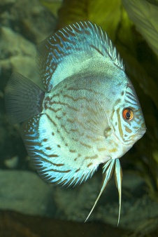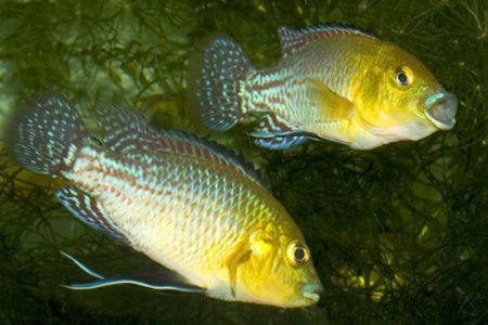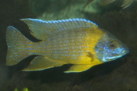 Jemná krása dospělého samce cichlidy Aulonocara z jezera Malawi. Jako u většiny aulonokar jsou i samičky tohoto druhu šedohnědé a podobají se samci jen tvarem.