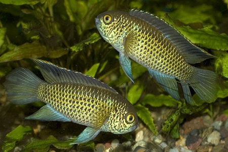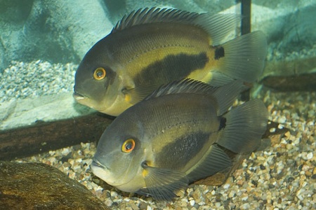 Velký pár jihoamerických cichlid klínoskvrnných na Smíchově pravidelně vyvádí potomstvo, které se v prvních týdnech živí sekretem z povrchu těla rodičů.