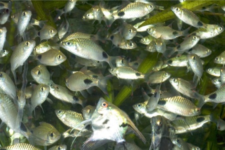 Jedním z mnoha druhů, které mladí akvaristé pod vedením zkušených vedoucích v kroužku množí, je i vzácná kaprovitá rybka Barbus sp. aff. mahecola. Na záběru jsou odrůstající rybky z odchovu.