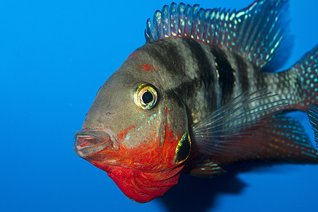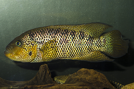 Mezi majestátními cichlidami si zasloužil určitě pozornost pár (na snímku samec) kančíků motagujských (Parachromis motaguensis), který ve své „nádrži obrů“ vystavovalo mělnické Vivárium společně s bichiry pruhoploutvými a krunýřovci velkoploutvými