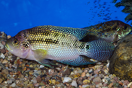 Dříve velmi hojnou, dnes docela vzácnou rybou je akarka zelená (Nannacara anomala). Drobná cichlidka není příliš náročná prostorově a nabízí bezpočet zajímavých etologických pozorování – na snímku je samec imponující před samičkou