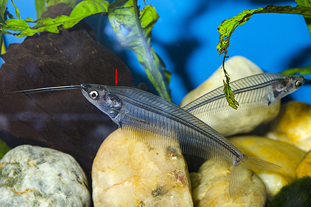 Kryptopterus vitreolus. Od podobných druhů se liší konkávní prohlubní v místech přechodu hlavy v trup (na snímku vyznačeno šipkou). O problematice druhové příslušnosti sklovitých sumečků se zájemci podrobně dočtou v článku