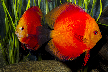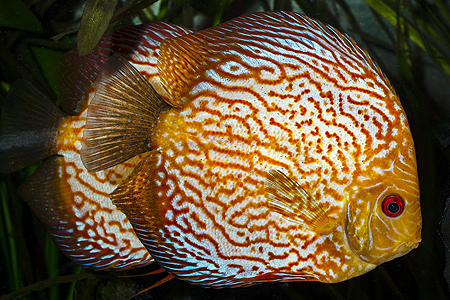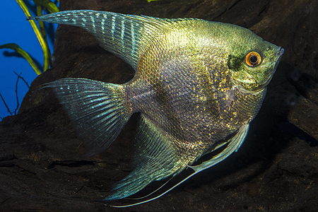 Z několika vystavených forem skalár amazonských jsem do této galerie vybral nepříliš často chovanou modrou formu – k vyniknutí potřebuje odpovídající tlumené osvětlení, v příliš jasném světle bývají tyto ryby velmi nenápadné