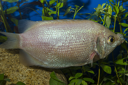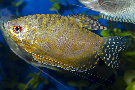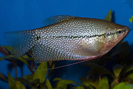 Hřbetní ploutev samce čichavce šedého (Trichopodus trichopterus, na snímku zlatá forma) je sice kratší než u čichavce perleťového, ale její zakončení do špičky je naprosto zřetelné