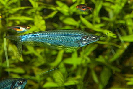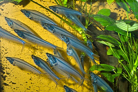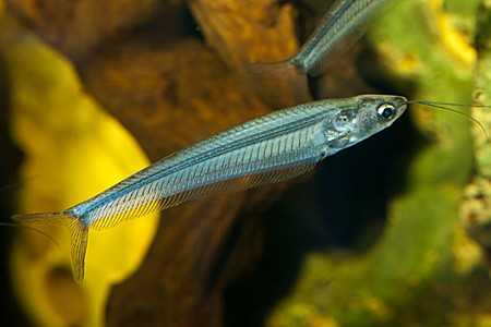 A nyní přichází slibovaný kontrast – do stejné čeledi patří také kolem 6 cm dlouhé rybičky, které evropští akvaristé včetně našich znají už 80 let a říkají jim většinou „sumeček průsvitný“ nebo „sklovitý“. Vzhledem k tomu, že jde o ryby opravdu průhledné, jimž jsou doslova vidět všechna žebra, jsou pro veřejnost atraktivní a mnozí akvaristé po nich zatouží. Jejich chov není nějak mimořádně náročný, ale ani úplně jednoduchý. Tyto ryby vyžadují pečlivé zacházení a udržování kvalitního prostředí v nádrži, takže se hodí spíše pro zkušenější akvaristy. Do jisté míry zvýšená choulostivost začíná už tím, že jde výlučně o ryby dovážené z volné přírody. Nádrž musí být větší, minimálně 100–120 cm dlouhá a o objemu alespoň 200–250 l. Důležité je tlumenější osvětlení, protože „sklovití sumečci“ jsou dost lekaví. Pokud si poraní, resp. ulomí své dlouhé vousy, rána se špatně hojí a vousy nedorůstají. Ideální je přítomnost nějaké velké rozložité solitérní rostliny, pod jejímiž listy se mohou sumečci přes den zdržovat. I když se nám totiž zdá, že jsou aktivní i přes den, není to úplně pravda. Den tráví zpravidla postáváním na podobných místech a „ožívají“ jen při krmení, opravdu aktivní jsou až po zhasnutí, kdy začínají plavat po celé nádrži. Nevyhovuje jim kyselá voda, pH by nemělo nikdy klesnout pod 6,5, samozřejmostí pak je nízký obsah dusíkatých látek ve vodě. Přednost má jednoznačně živá masitá potrava. A ještě jedna důležitá věc – „sklovití sumečci“ jsou ryby hejnové, pořizujeme je vždy ve skupině minimálně 6–10 jedinců.