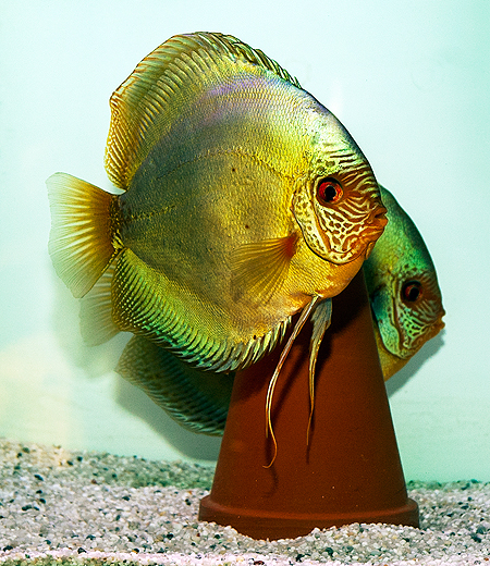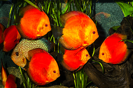 Jednou z často diskutovaných otázek je typ akvária. Mají v něm být rostliny, nebo má akvárium napodobovat přírodní prostředí terčovců a být dekorováno pouze kameny a kořeny? A jak je to s dalšími rybami – dají se některé chovat společně s terčovci, nebo je lepší nádrž druhová? Ani v jednom případě nejde o vzájemně se vylučující varianty, v obou ale hraje důležitou roli vysoká teplota vody. V té se některým rostlinám nedaří a v kombinaci s nedostatečným osvětlením vzhledem k výšce akvária pak může vzniknout dojem, že terčovce je třeba chovat v nádrži bez rostlin. Přitom velká nádrž s rostlinami a terčovci může být dominantní ozdobou interiéru. Vhodné jsou různé druhy šípatkovců (Echinodorus), větší druhy zákrutich (Vallisneria), zakucelka plazivá (Ludwigia repens), komu nevadí kombinace s jinými než jihoamerickými rostlinami, může použít i některé druhy asijských kryptokoryn, např. Wendtovu (Cryptocoryne wendtii), olivovou (C. beckettii) nebo Walkerovu (C. walkeri), případně africké anubisy. Na hladinu se hodí plovoucí voďankovec (Limnobium) nebo babelka řezanovitá (Pistia stratiotes). V této souvislosti ještě doplňme, že holé hygienické nádrže bez substrátu na dně a s jedinou dekorací – keramickým kuželem jako třecím substrátem, se používají k trvalému umístění ryb v profesionálních chovech. Doma, kde chováme ryby pro potěšení a krásu, můžeme takovou nádrž s úspěchem použít pro výtěr, ale ne k dlouhodobému chovu.