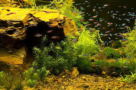 Prvním faktorem, na který je třeba se zaměřit, je intenzita osvětlení. Většina domácích akvárií je z pohledu rostlin osvětlována nedostatečně! Přispívají k tomu i výrobci komerčních setů, kteří dodávají kryty se zabudovaným osvětlením, jež bez často problematického doplnění dodatečných světelných zdrojů prostě dostatek světla neposkytují. A zase se dostáváme k četbě literatury a dodržování dobrých rad. Pořád dokola se píše, že při osvětlení zářivkami musí jejich celkový příkon dosahovat zhruba 0,5 W/l vody, přičemž to platí pro výšku vodního sloupce maximálně 40–50 cm, u vyšších akvárií to musí být více. A pořád dokola si na to, že jim nerostou rostliny, stěžují akvaristé, kteří osvětlují stopadesátilitrovou nádrž jednou třicetiwattovou trubicí. Bez dostatečně intenzivního světla většina vodních rostlin spíše jen živoří. Intenzitu nelze nahradit délkou, nemá smysl svítit 16 hodin málo, to jen podporuje růst nežádoucích řas. Stačí 10, maximálně 12 hodin osvětlení denně, ale dostatečně intenzivního. A další rada na začátek: nebuďte upnuti na jeden konkrétní druh, který za každou cenu chcete v nádrži mít. Pokud se zrovna tomu jednomu druhu nebude ve vaší vodě, při vašem osvětlení, s množstvím živin ve vaší nádrži atd. dařit, nezoufejte – akvárium bude vypadat stejně pěkně i s druhy jinými. Ideální je, osázet nádrž při zakládání větším počtem druhů rostlin, klidně osmi nebo deseti. Je úplně normální, že několika se bude dařit výtečně, další budou vcelku rozumně přežívat, aniž by se příliš rozrůstaly, a několika se nebude dařit vůbec. Po čase tak vznikne jedinečná kombinace druhů, která bude ve vašem akváriu prospívat. Ale znamená to také, s výjimkou velkých, vysloveně soliterních druhů, vysadit na začátku od každého druhu několik jedinců pohromadě v „ostrůvku“. Jestliže zasázíme jednotlivé rostlinky jednoho druhu rozptýleně po celém akváriu, nevypadá to hezky a šance na jejich prosperitu se snižují.