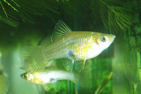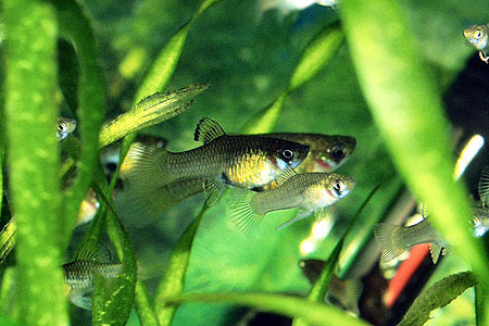 V průměru 20 mláďat se rodí po 21 dnech a jsou velmi subtilní. Zpočátku rostou pomalu. Žerou velmi ochotně, ale vzhledem k malým tlamkám vyžadují drobné krmení i dospělí. Při krmení živým cyklopem se u nich často objeví krupička, která se ale velmi snadno vyléčí k tomu určenými komerčními léčivy. Stejnou službu mi vždy udělalo osolení vody (na 10 l polévková lžíce) a dvoudenní temperování na 30 °C.