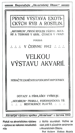 Pod titulkem „Výstava Akvaria odložena“ přináší AO dne 1.6.1912 následující prohlášení: